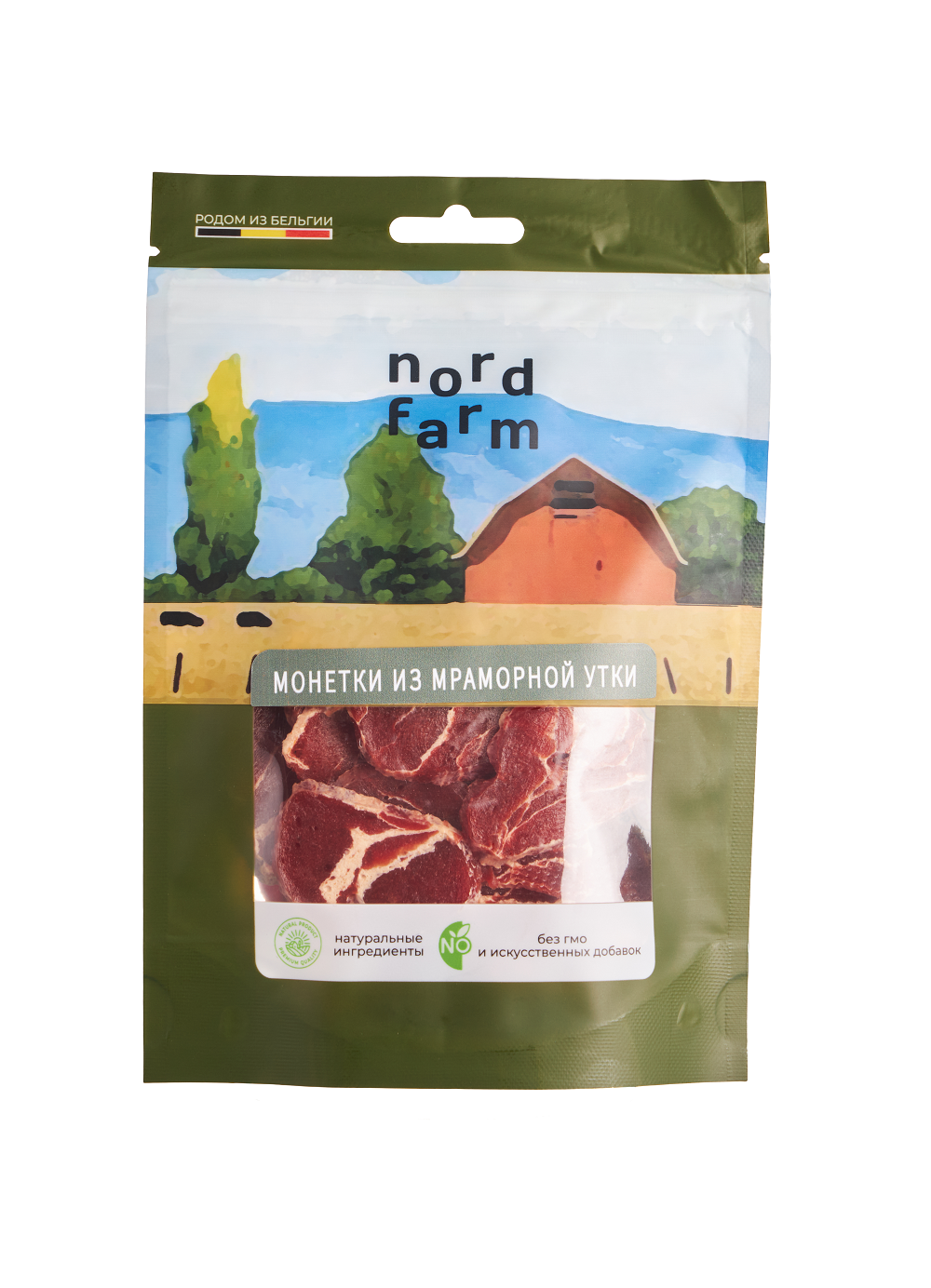 Лакомство представляет собой монетки из мраморной утки весом 800 грамм. Этот продукт предназначен для всех пород собак, включая крупных, мелких и средних.